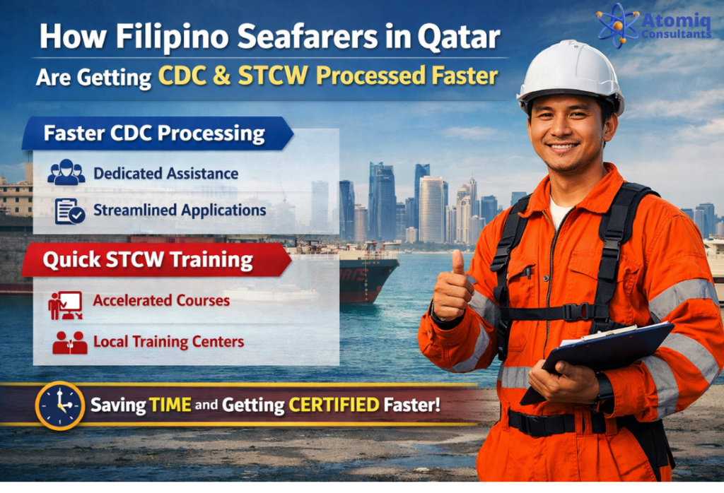 Filipino seafarers in Qatar are getting their CDC and STCW processed faster by partnering with specialized maritime documentation consultants like Atomiq Group (Seaman Books), who streamline requirements, guide flag selection, and fast‑track applications for Gulf-based crew. This reduces waiting time, avoids rejected applications, and helps them stay employable in a highly competitive offshore and maritime job market.​